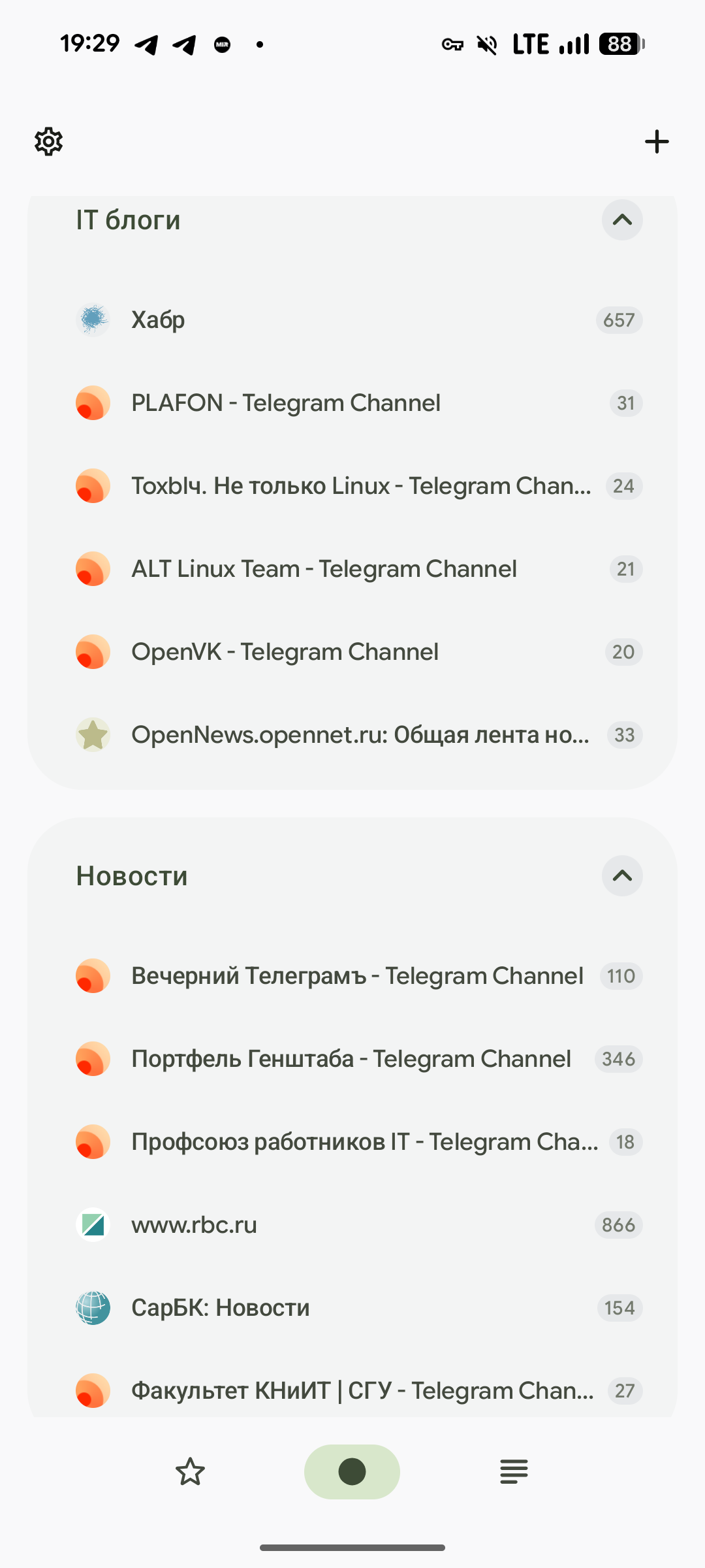 Недавно я интереса ради попробовал настроить RSS в Thunderbird на линуксе и Read You на Android, это… оказалось невероятно удобным! Я разбил контент на 4 тематические ленты, в которые подключил тг-каналы через мост и напрямую некоторые сайты.